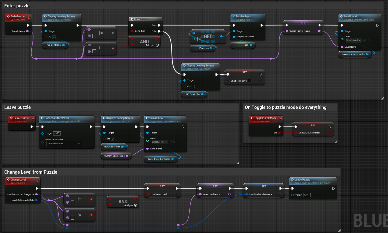 As the Chief Technical Officer I was responsible for majority of the systems implemented in the game. I used Blueprints to code main game systems: Level Loading, Modular Physics Puzzle System, UI Integration.