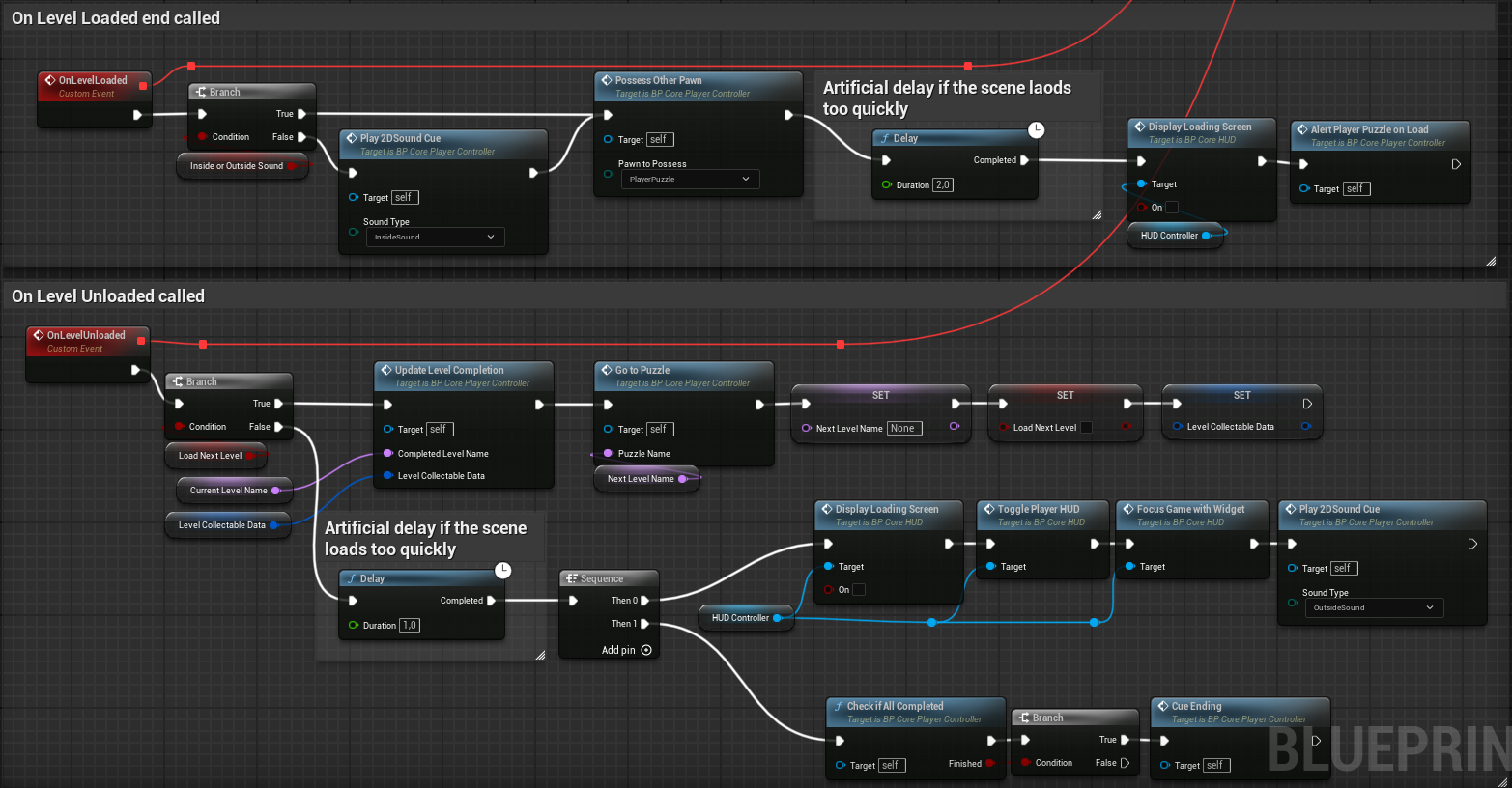 The level loading system uses Level Streaming to dynamically load the levels into the world. Level is loaded and unloaded with a loading screen matching the time it takes the level to load.